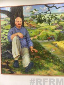 В центре же триптиха — полотно «Батька», посвященное Александру Лукашенко. На нем Лукашенко, держа в руках василек, сидит под дубом лицом к зрителю: рядом с ним — автомат, а позади — трактор, церковь, и луг, на котором пасутся коровы.