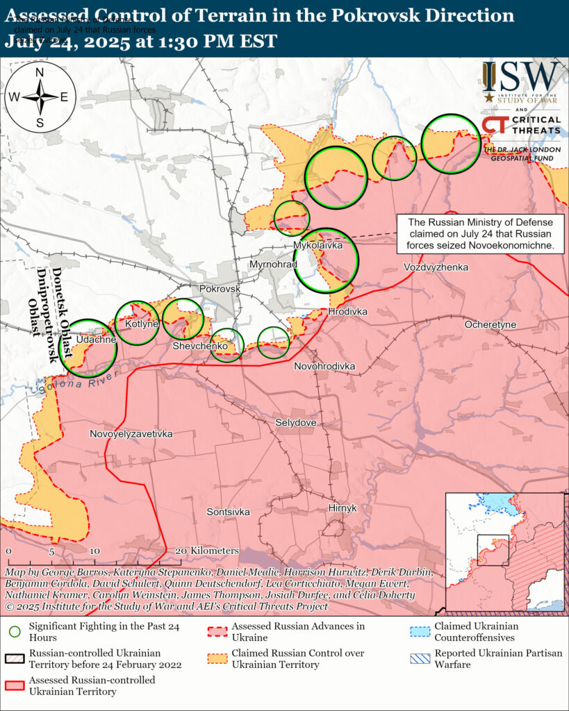 В июле московитам удалось взять Покровск в полуокружение. Покровский выступ еще велик, однако пути снабжения обороняющихся под угрозой, и не исключено, что рано или поздно украинским войскам придется его оставить.