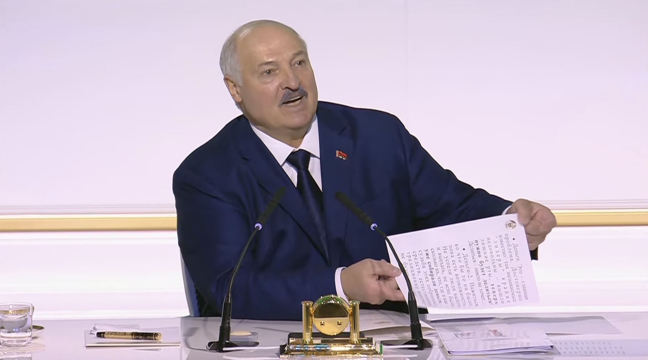 В запале, выступая сегодня перед делегатами ВНС, Александр Лукашенко стал размахивать одним из листков с тезисами для ответа на заранее подготовленный вопрос. Тезисы написаны гигантскими буквами для слабовидящих.