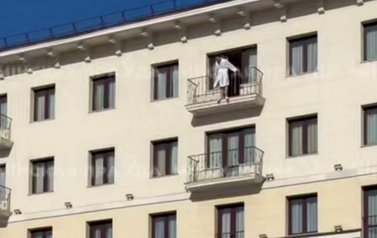 В гостинице «Минск» в центре города мужчина вышел за ограждение балкона на шестом этаже и ходит по краю, держась за металлическое ограждение. За ситуацией следит корреспондент «Минской правды».