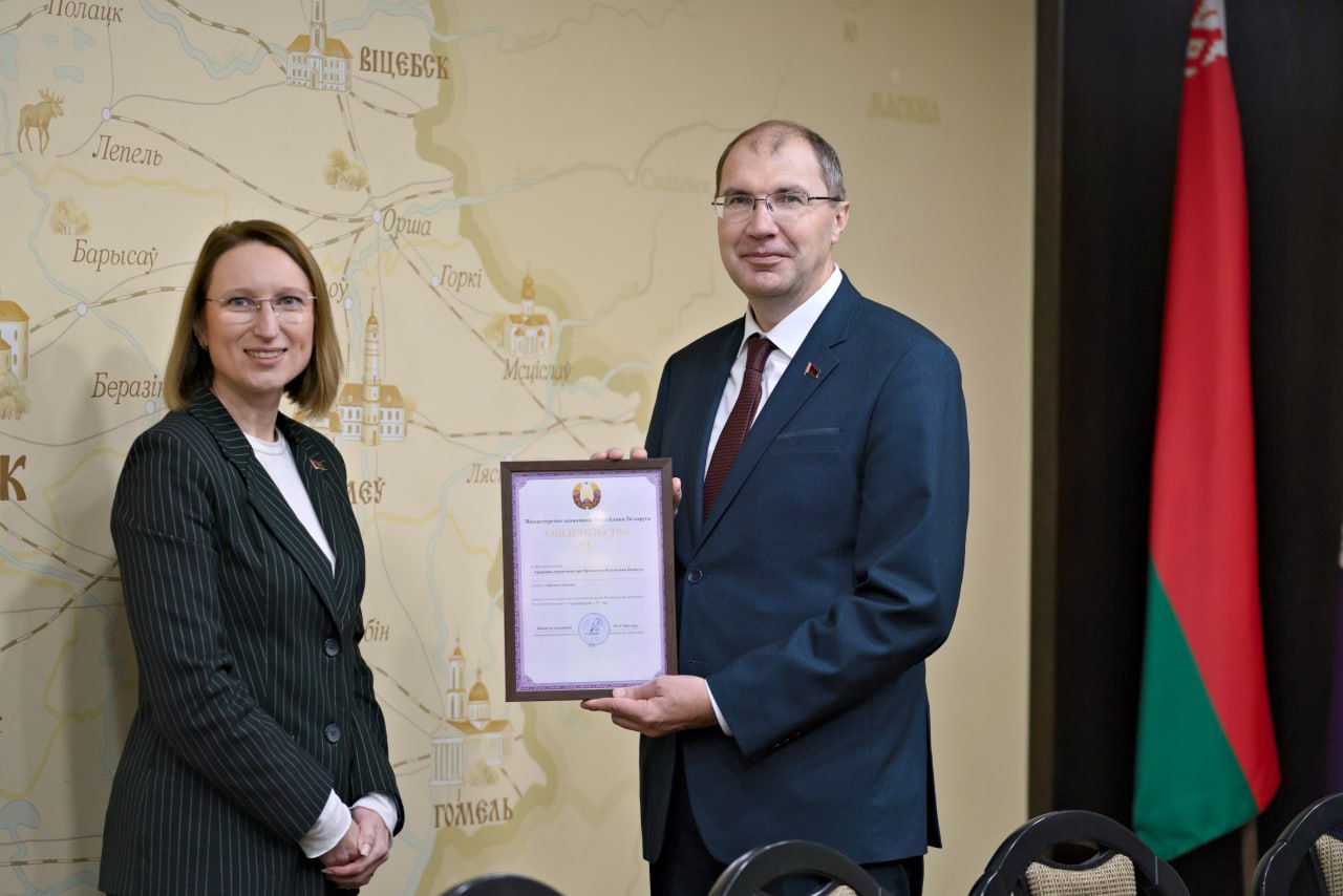 Свидетельство №1 ректору академии Денису Дуку вручила замминистра экономики Мария Мажинская.