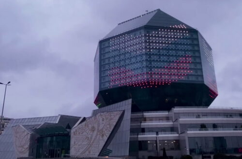 На Национальной библиотеке Беларуси появился российский флаг, вся реклама на здании сегодня отменена.