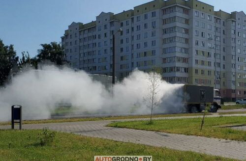 На улице Пролетарской в Гродно задымился автозак. Видеозапись опубликовал Telegram-канал АвтоГродно.