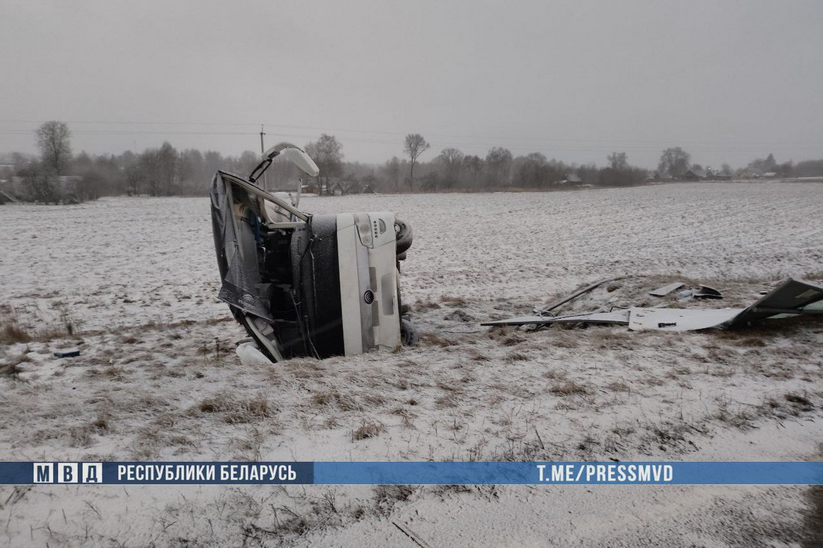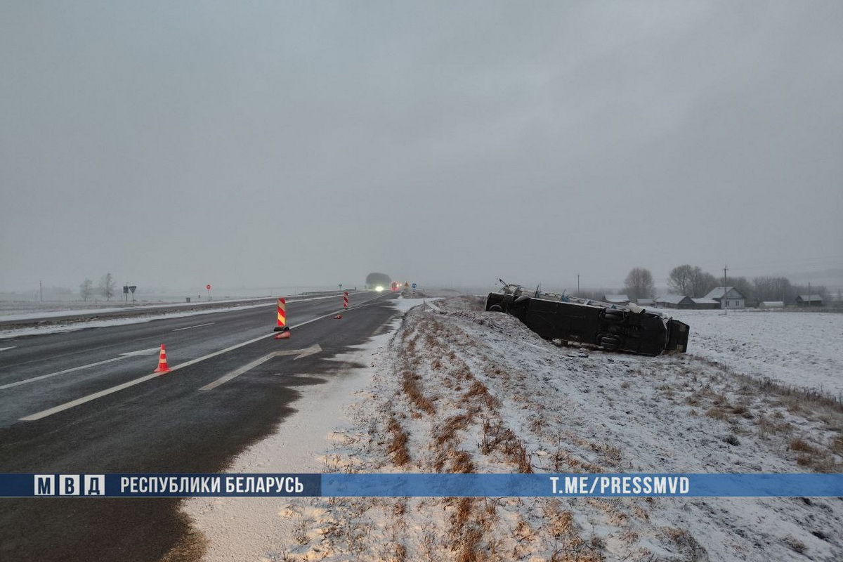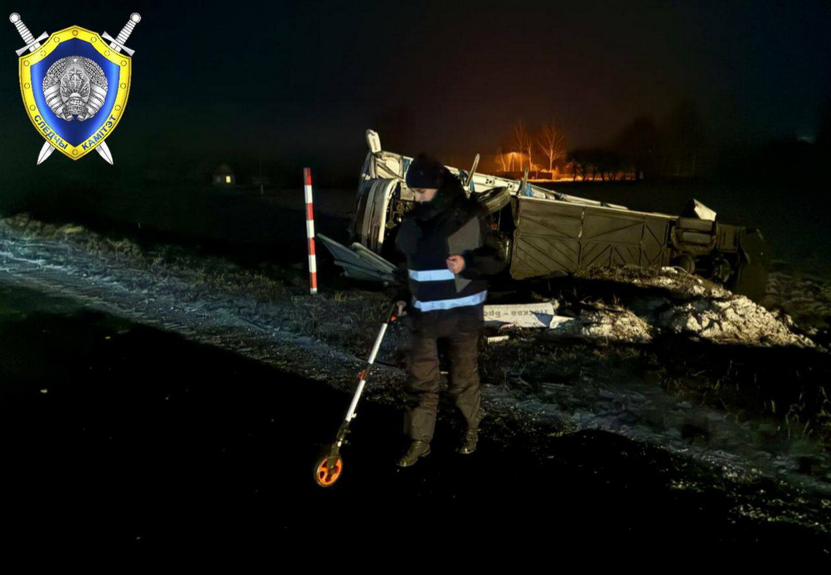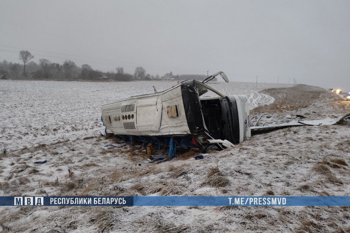 43-летний водитель автобуса ехал со стороны Минска, не справился с управлением, слетел в правый по ходу движения кювет и опрокинулся. В салоне находились два водителя и 12 пассажиров. В результате ДТП 53-летняя женщина погибла, 6 человек госпитализированы.