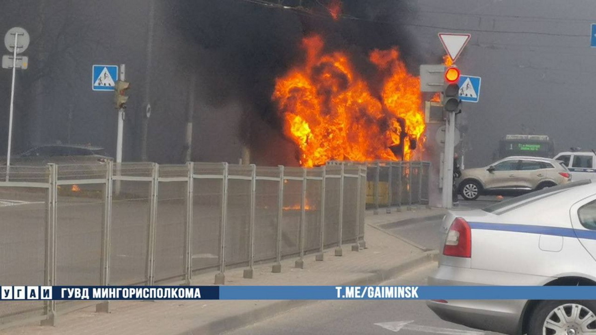 (Обновлено) Автобус МАЗ загорелся в Минске на перекрестке Логойского тракта и улицы Гамарника.