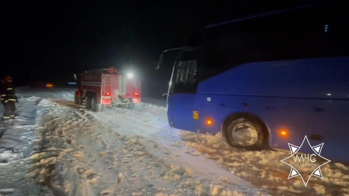 “У Карэліцкім раёне каля вёскі Азёрскае ў снезе затрымаўся турыстычны аўтобус, у салоне якога знаходзіліся 48 чалавек, з іх 6 — дзеці. Ніхто не пацярпеў, пасля буксіроўкі аўтобус працягнуў рух па маршруце”, — гаворыцца ў паведамленні МНС.