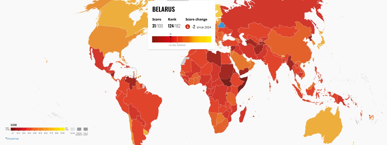 Беларусь заняла в нем 124-е место из 182 стран, включенных в рейтинг. В сравнении с 2024 годом наша страна опустилась на 10 позиций. Индекс воспринятия коррупции составил 31 балл, что на 2 балла меньше, чем за год до этого.