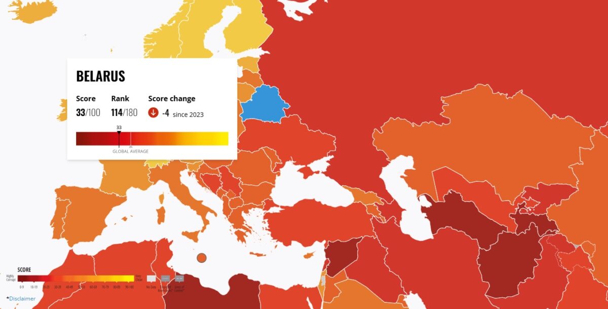 Беларусь опустилась в рейтинге восприятия коррупции, который сегодня опубликовала организация Transparency International. В рейтинге 2024 года наша страна получила 33 балла из 100 возможных и окзалась на 114-м месте из 180 стран. В сравнении с рейтингом 2023 года она опустилась на 4 позиции.