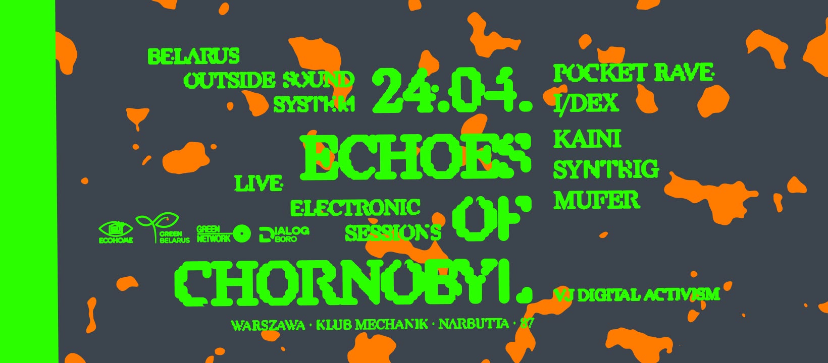 24 красавіка ў варшаўскім клубе Mechanik адбудзецца адмысловая сесія праекта Belarus Outside Sound System — «Echoes of Chornobyl». Падзея аб’яднае электронную музыку і візуальнае мастацтва, каб сабраць сродкі для палітвязняў і нагадаць пра наступствы найбуйнейшай тэхнагеннай аварыі.