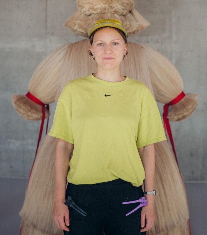 Цэнтральным экспанатам стане манументальная скульптура «Шэптам тканая» — вялікая лялька з ільняной кудзелі (пакулля). Яна сімвалізуе вартаўніцу памяці і рэпрэзентантку жаночай сілы, адлюстроўваючы пераход ад высілку да адпачынку, ад хаосу да засяроджання. Акрамя таго, наведвальнікі ўбачаць тры новыя працы, выкананыя ў рэдкай тэхніцы саламянай інтарсіі.