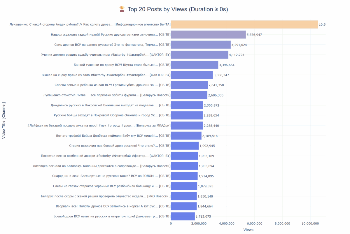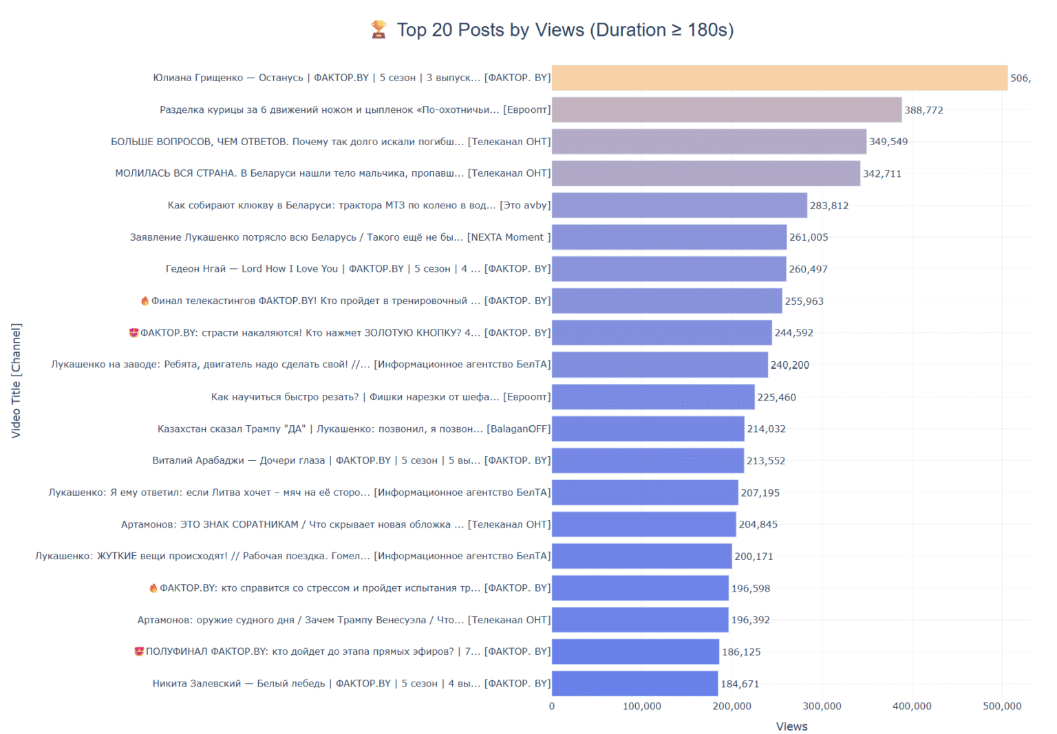В исследование вошли 479 каналов, которые соответствуют ряду критериев: активность в течение последнего года, минимум 1000 подписчиков и не менее 20% аудитории из Беларуси. Всего за месяц авторы разместили 13 381 видео — именно они сформировали итоговый массив данных.