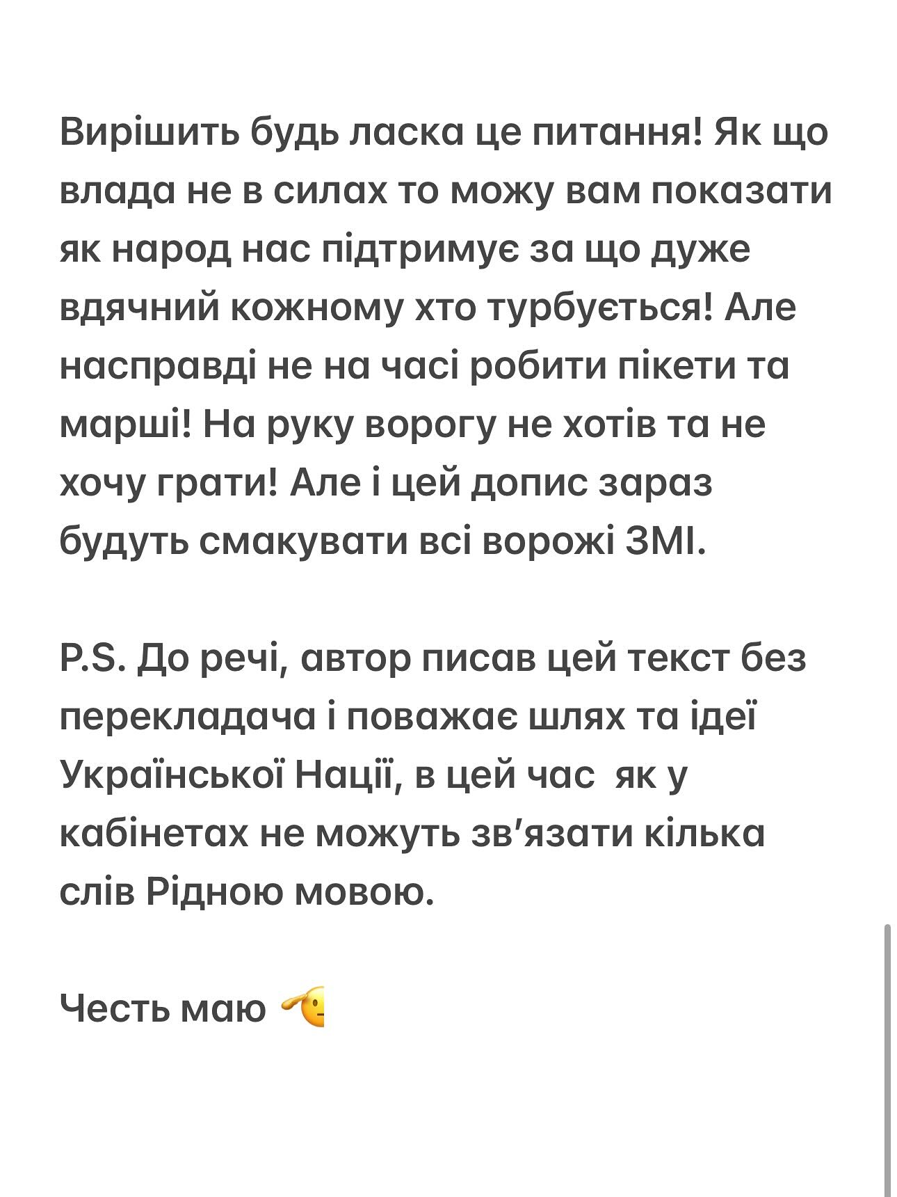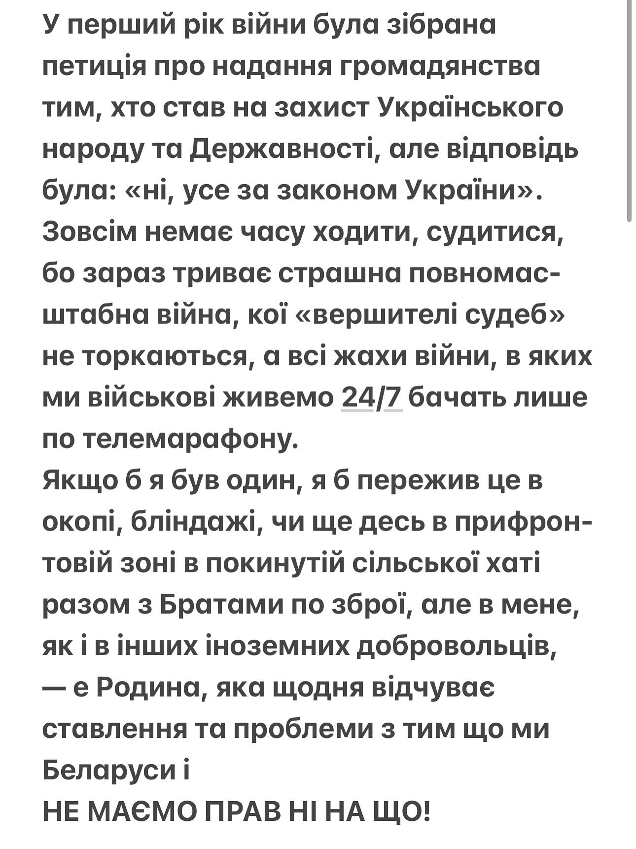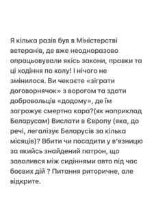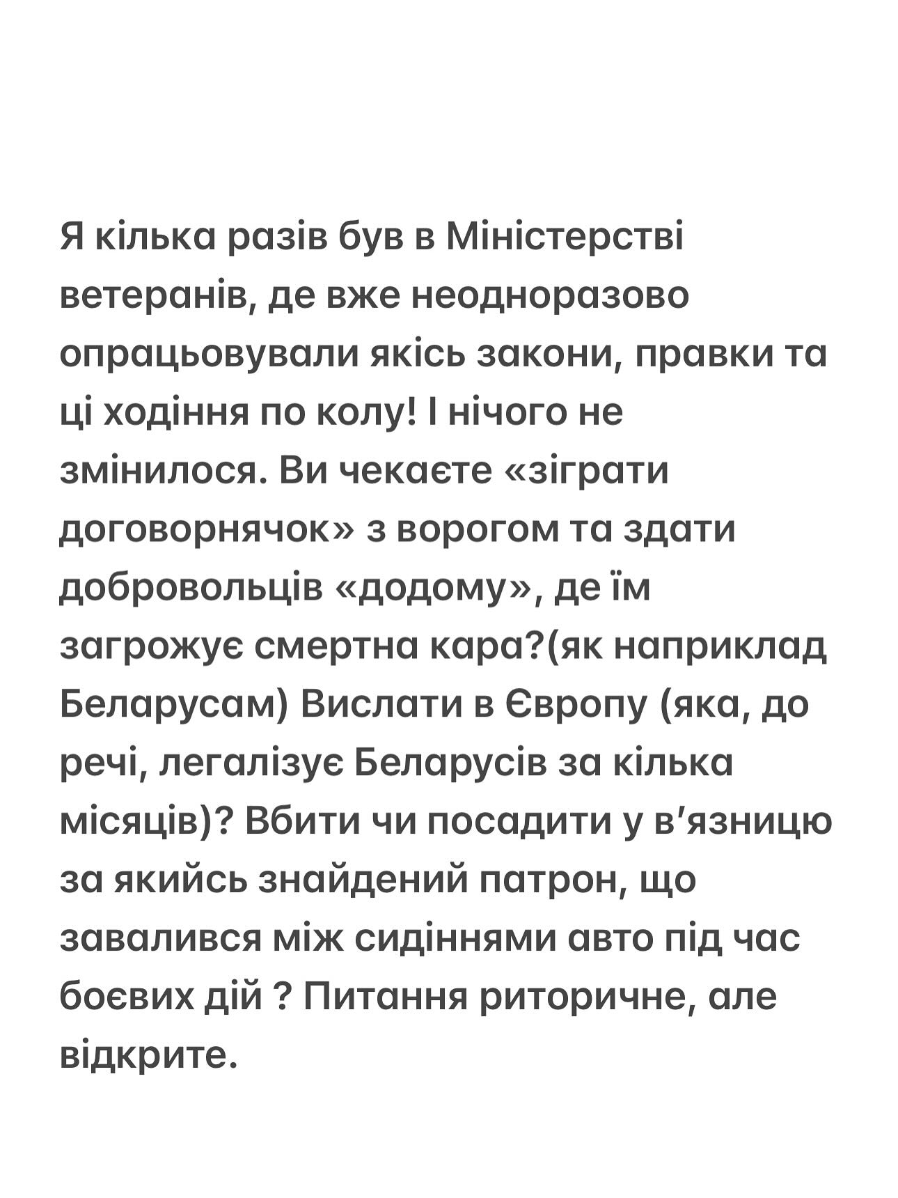 «Я несколько раз был в Министерстве ветеранов, где уже неоднократно разрабатывали какие-то законы, правки, и это хождения по кругу! И ничего не изменилось. Вы ждете «сыграть договорнячок» с врагом и сдать добровольцев «домой», где им грозит смертная казнь, как, например, беларусам? Выслать в Европу, которая, кстати, легализует беларусов несколько месяцев? Убить или посадить в тюрьму, за какой-нибудь найденный патрон, который завалился между сидениями авто во время боевых действий? Вопрос риторический, но открытый», — написал доброволец.