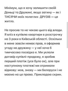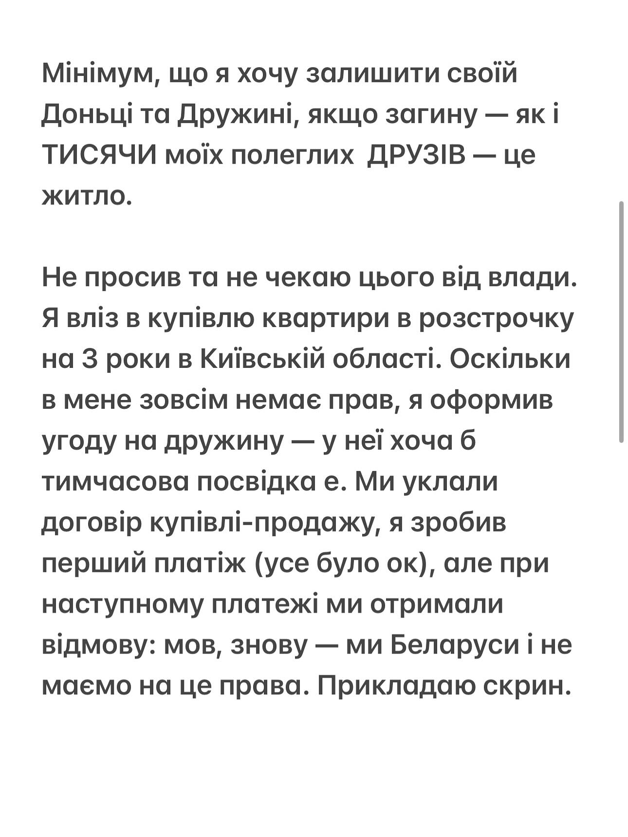 «Я влез в покупку квартиры в рассрочку на 3 года в Киевской области. Поскольку у меня совсем нет прав, я оформил договор на супругу — у нее хотя бы есть временная справка (разрешение на проживание — прим.). Мы составили договор купли-продажи, я сделал первый платеж (все было ок), но при следующем платеже мы получили отказ: мол, снова — мы беларусы и не имеем на это права», — рассказал он.