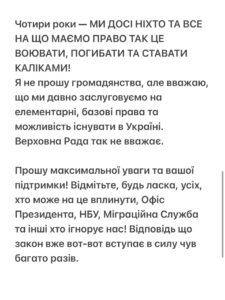 «Четыре года — мы до сих пор никто и все, на что имеем право — это воевать, погибать и становиться калеками. Я не прошу гражданства, но считаю, что мы давно заслужили элементарные, базовые права и возможность существовать в Украине. Верховная Рада так не считает», — добавил он, попросив поддержать его пост.