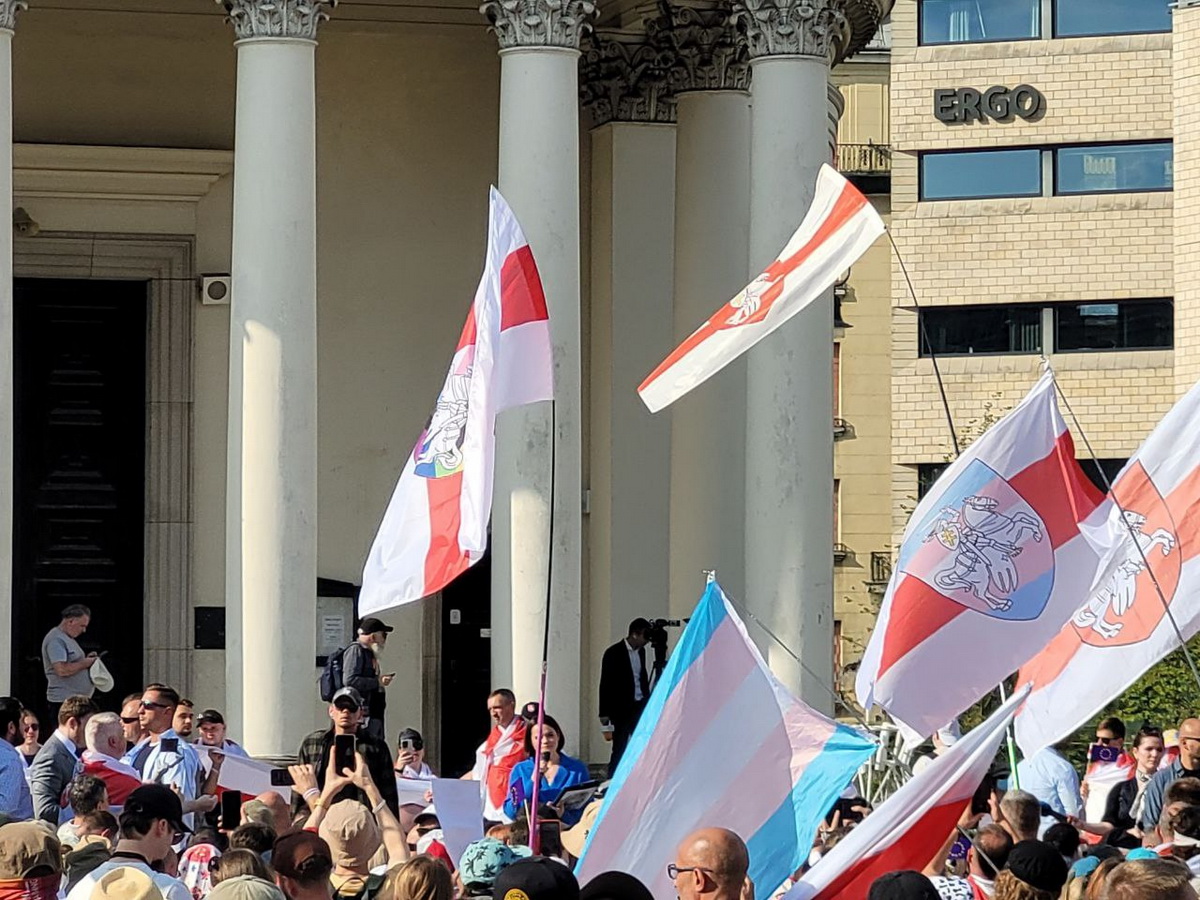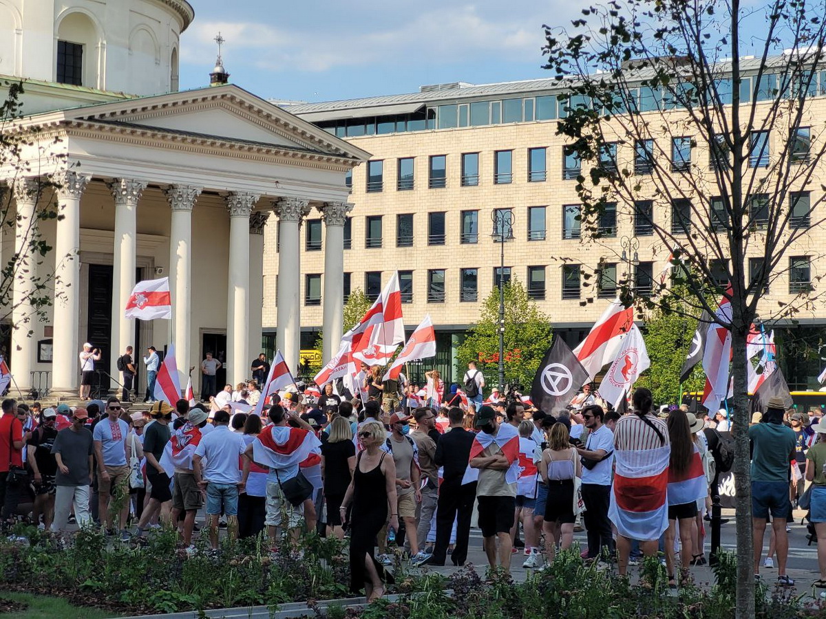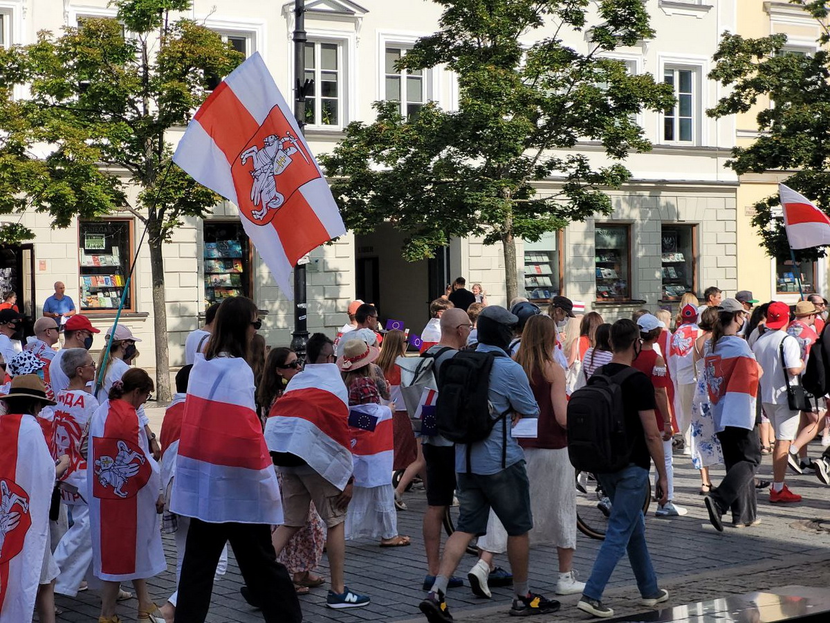 Многие участники пришли в масках в связи с угрозами беларусских силовиков. Напомним, 5 августа Следственный комитет заявил об идентификации 207 человек, проживающих в Польше, США, Литве, Канаде и Великобритании и участвовавших в акциях и шествиях на День Воли. Вынесены постановления о проведении обысков и наложении ареста на их имущество.