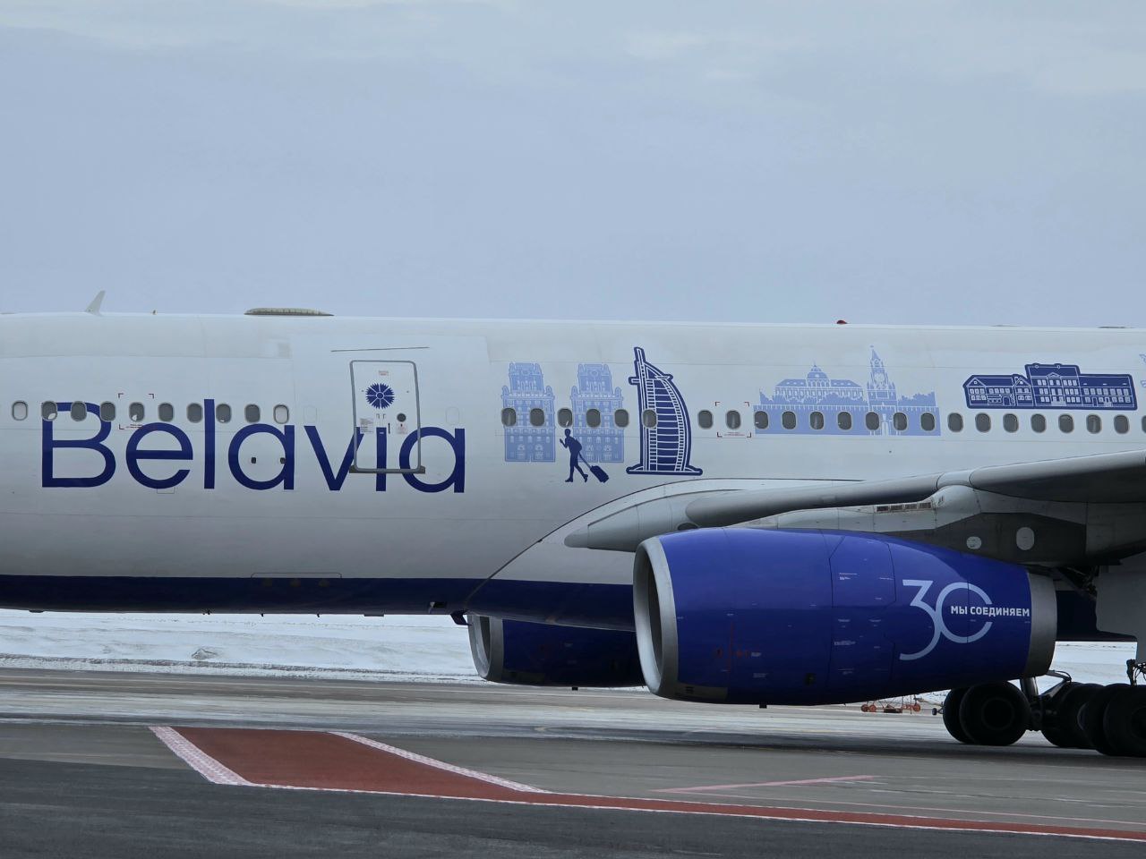 На фюзеляже самолета изображены восемь достопримечательностей разных городов, в том числе Минска.