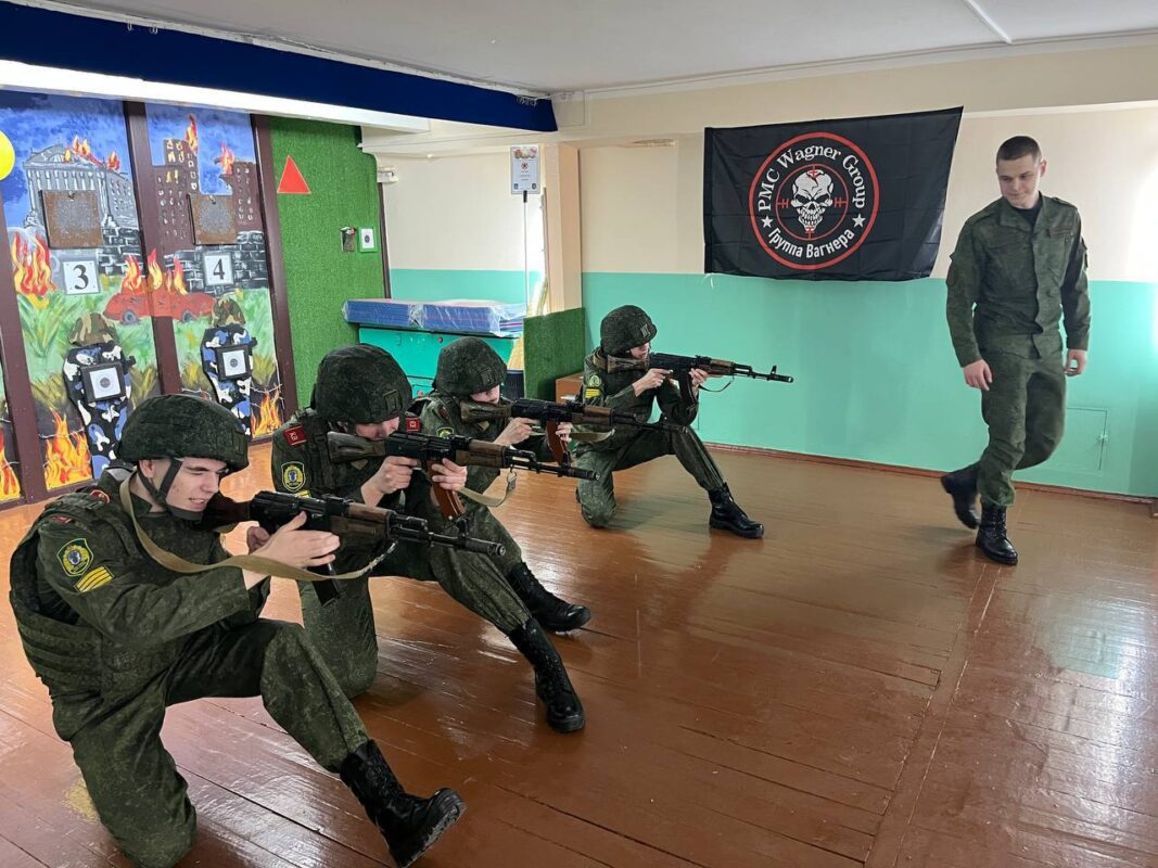 На фотографиях студенты Беларусского государственного университета информатики и радиоэлектроники в тире тренируются стрелять из автомата и заряжать обоймы патронами. Обращает на себя внимание, что все это они делают на фоне черного флага российской ЧВК «Вагнер».