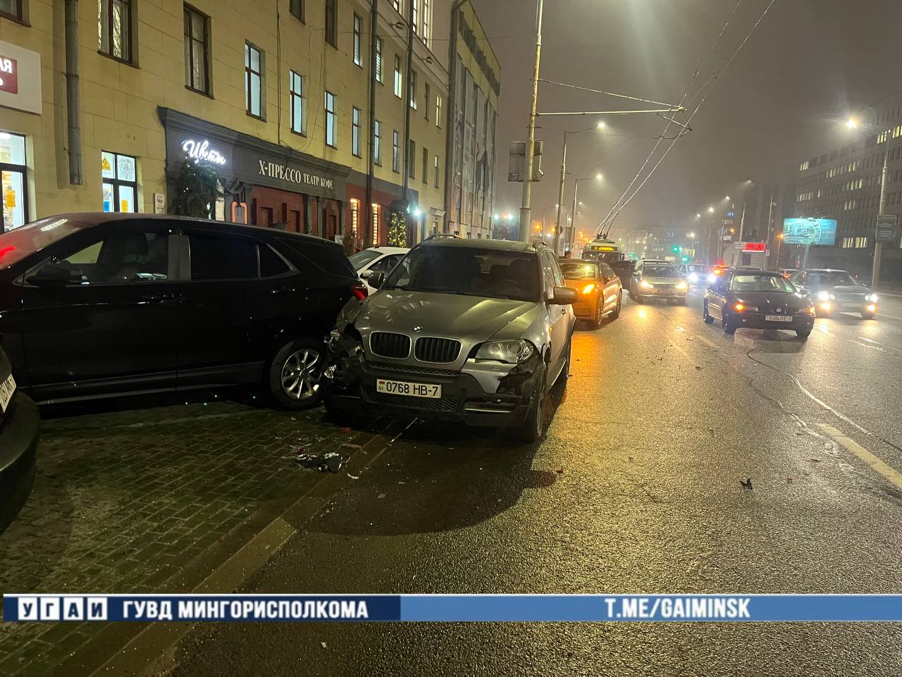 Водитель BMW столкнулся с четырьмя автомобилями на улице Кальварийской в Минске, сообщает УГАИ ГУВД Мингорисполкома.