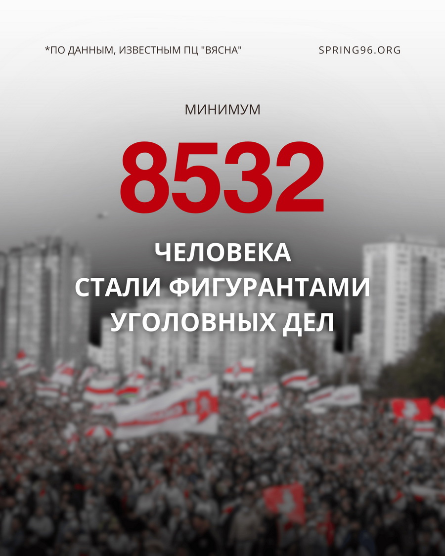 Минимум 8532 человека стали фигурантами уголовных дел. В отношении не менее 7299 человек были вынесены политически мотивированные приговоры.