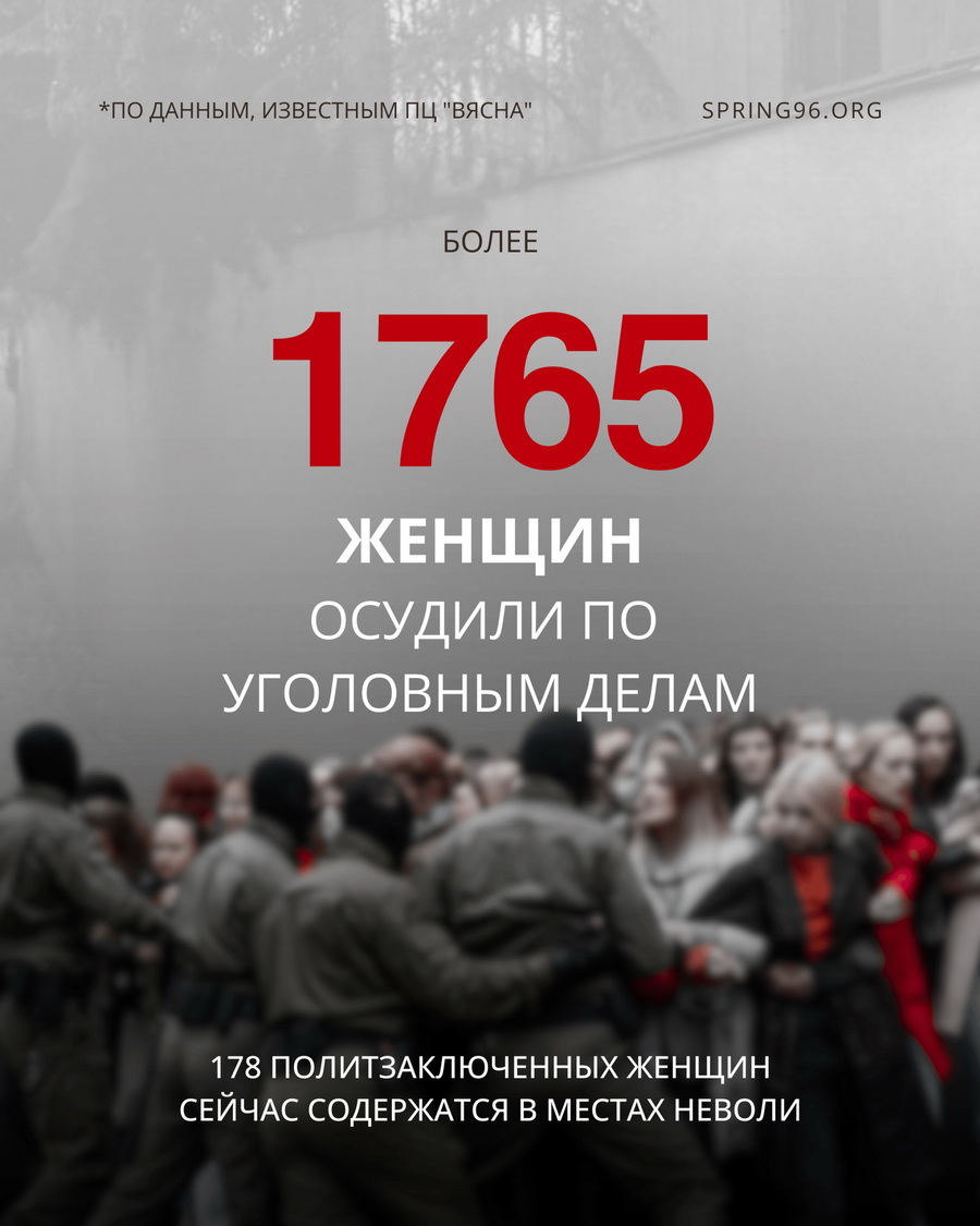 «Вясне» известно как минимум об 1765 женщинах, осужденных по уголовным статьям. Прямо сейчас в местах неволи находятся 178 политзаключенных женщин, среди которых пенсионерки, женщины с серьезными заболеваниями, а также многодетные матери.
