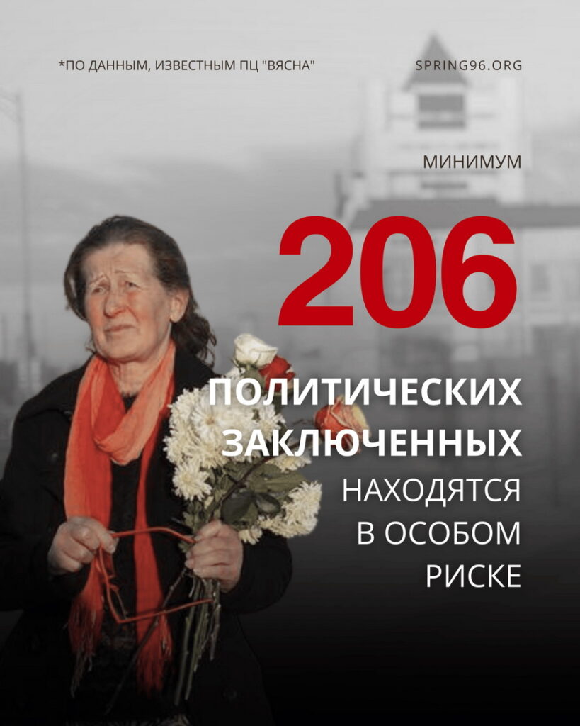 Не менее 206 политзаключенных находятся за решеткой в особом риске. Это люди, имеющие проблемы со здоровьем, несовершеннолетние на момент совершения действий, вменяемых им в вину, многодетные и другие люди в тяжелых семейных обстоятельствах, люди, находящиеся на принудительном психиатрическом лечении в закрытых учреждениях.