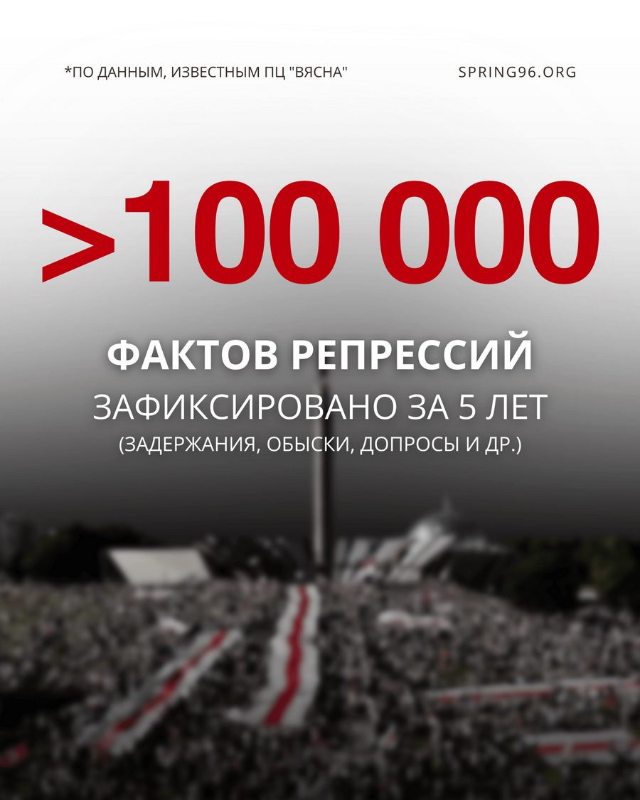 Правозащитный центр «Вясна» к годовщине начала протестов против фальсификации выборов опубликовал статистику массовых репрессий в Беларуси. По данным правозащитников, за 5 лет было зафиксировано более 100 тысяч фактов репрессий — обысков, кратко- и долгосрочных задержаний, допросов.