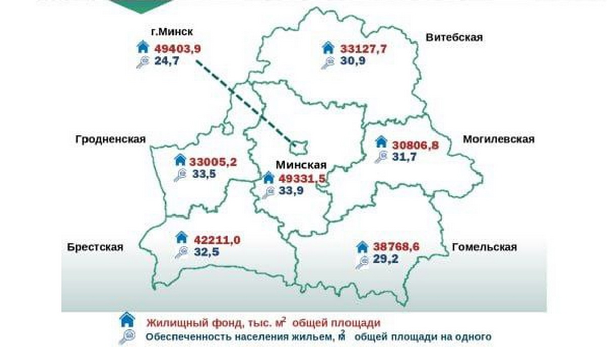 Наивысший показатель обеспеченности в Минской области — 33,9 кв. м., а наименьший — в Минске, 24,7 кв. м.