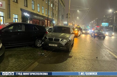 Водитель BMW столкнулся с четырьмя автомобилями на улице Кальварийской в Минске, сообщает УГАИ ГУВД Мингорисполкома.
