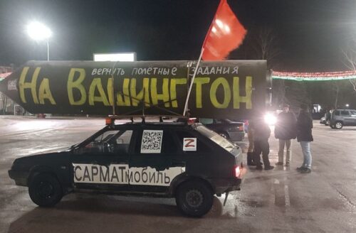 В Гомеле заметили «сарматмобиль» с макетом ракеты и флагом на крыше. Фото автомобиля публикует «