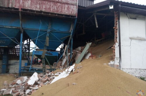 Вчера вечером в Ошмянах по улице Чкалова рухнула стена зерносклада. Под обломками конструкции и зерном