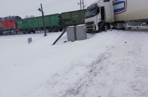 Грузовой поезд столкнулся с фурой на железнодорожном переезде возле деревни Ларищево. Момент ДТП попал на видео.