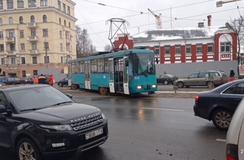 На проспекте Машерова в центре Минска сошел с рельсов трамвай. По фотографиям видно, что трамвай также