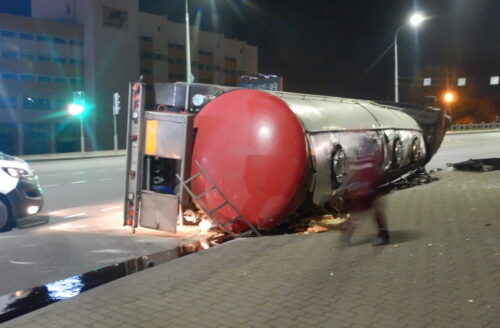 ЧП произошло в понедельник поздно вечером. Сообщение об опрокидывании автоцистерны поступило в МЧС в 22:31.