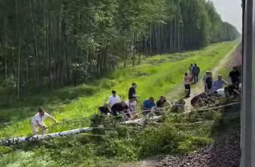 Пассажиры поезда помогли убрать березу, упавшую на пути в результате непогоды. Видео опубликовала в Instagram