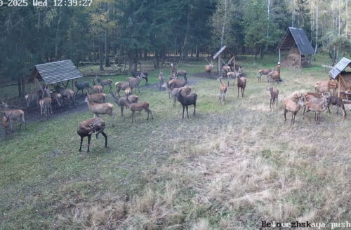 В объектив онлайн-камеры в Беловежской пуще попала большая группа оленей, собравшихся у кормушек.