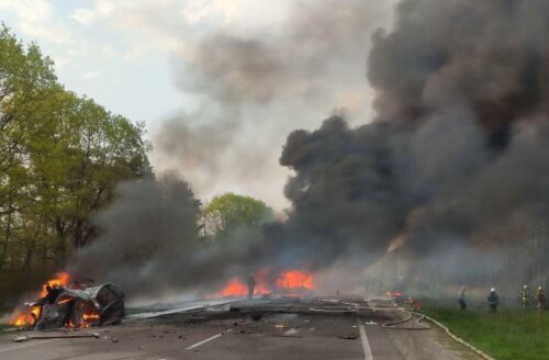 3 мая в Ровенской области Украины столкнулись маршрутный автобус, легковой автомобиль и бензовоз.