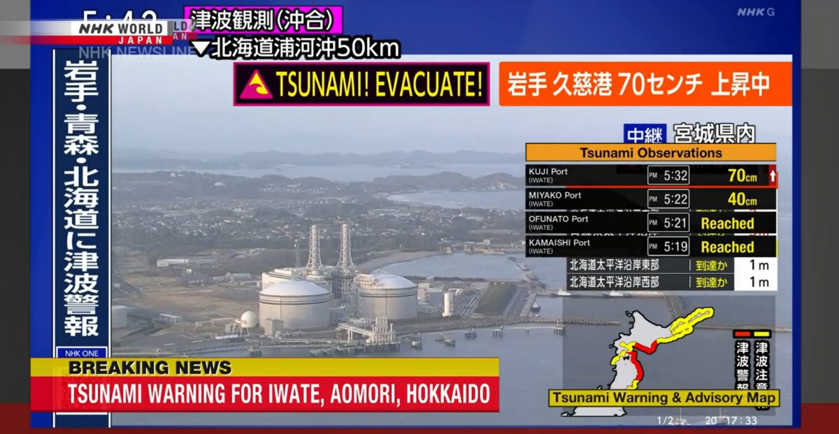 Метеорологическая служба выпустила предупреждение о цунами для провинций Ивате, Аомори, а также для побережья Хоккайдо.