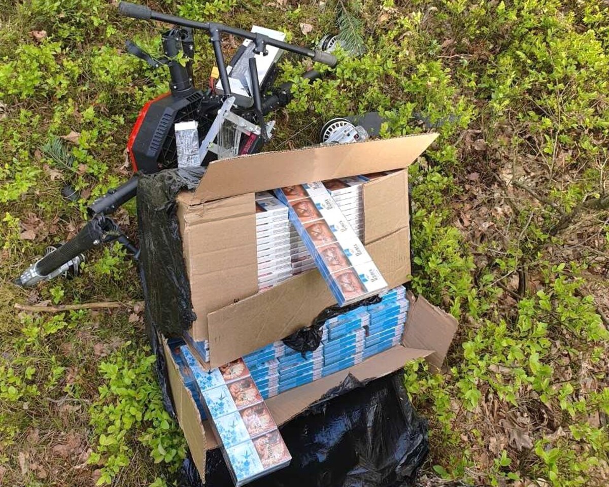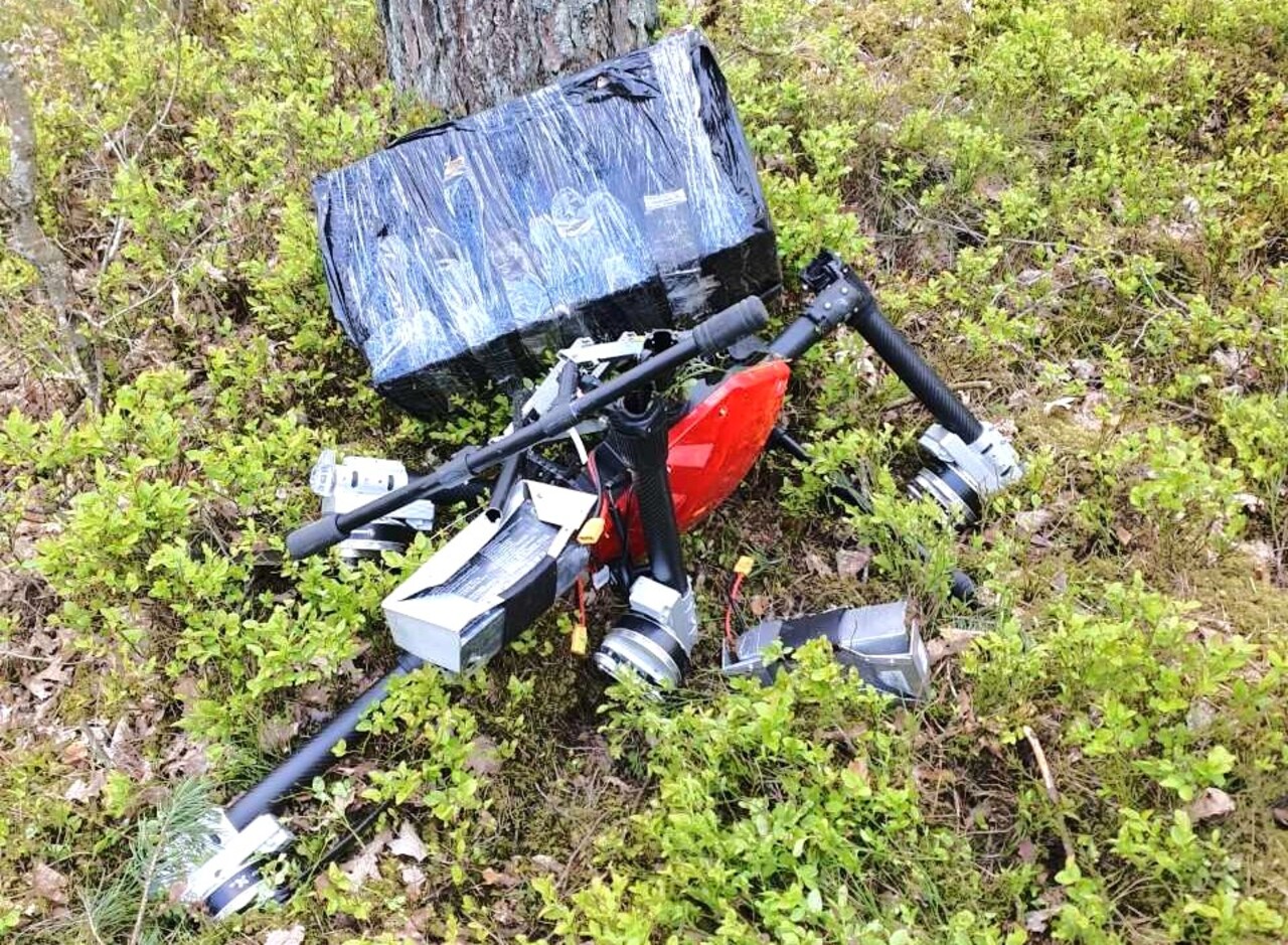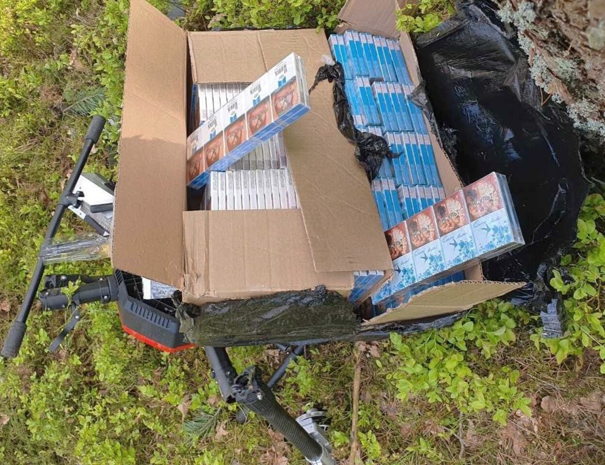 Первый дрон заметили в Лаздийском районе возле деревни Пертако в 650 метрах от беларусской границы. Его сбили при помощи специального оборудования. Беспилотник Hobbywing перевозил 750 пачек беларусских сигарет стоимостью 3615 евро.