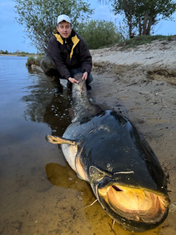 «26 апреля рыбачили с кумом на Припяти в окрестностях Мозырского района. Поклевка случилась около восьми часов вечера, и сразу стало понятно, что на крючке сидит крупный сом. Вываживание длилось минут тридцать, и на протяжении всего этого времени рыба не поддавалась, пытаясь уйти в глубину. Сдался сом лишь совсем обессилевши и глотнув воздуха, после чего я смог подтянуть его к берегу, а кум только с третьей попытки вытянул гиганта из воды», — рассказал Федор сайту fishingby.com.