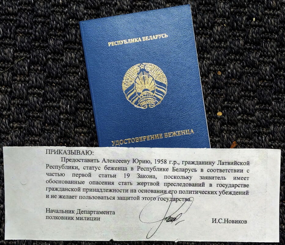 “I order: To grant Alekseyev Yuri, born in 1958, a citizen of the Republic of Latvia, refugee status in the Republic of Belarus in accordance with Part One of Article 19 of the Law, as the applicant has well-founded fears of persecution in his country of citizenship on the basis of his political beliefs and does not wish to seek protection from that state,” the document reads.
