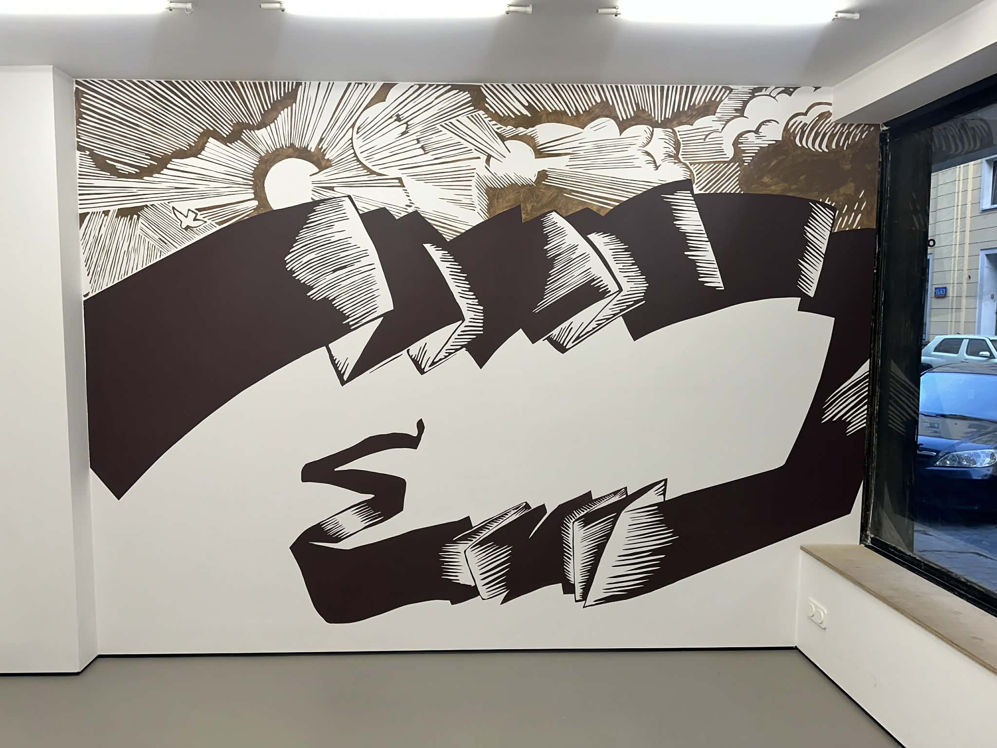 У цэнтры экспазіцыі праекта — фрэска «Калі сцяг становіцца пейзажам», створаная спецыяльна для варшаўскай прасторы. Яна выглядае так, нібы заўсёды была тут — яе хутчэй «адкрылі», чым вырабілі. На фрэсцы — пусты сцяг без надпісаў і два сонцы, што завіслі паміж рэальнасцю і выдумкай.