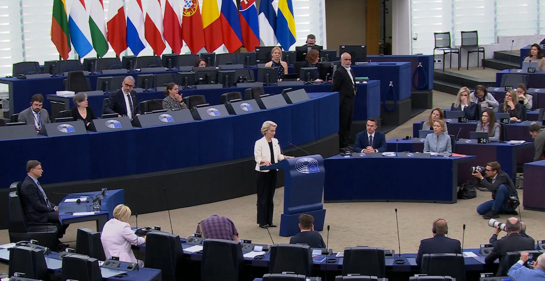 Мы усердно работаем с Украиной, чтобы открыть первый кластер переговоров о присоединении и открыть все кластеры в 2025 году. Присоединение Украины к нашему Союзу является величайшей гарантией справедливого и прочного мира. В нашей истории мир и европейская интеграция всегда шли рука об руку. Так что давайте приведем Украину в наш Союз. Давайте вместе идти по пути мира», — заключила фон дер Ляйен.