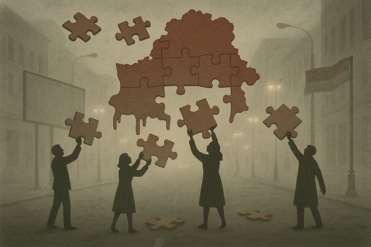 Пазл по факту сложился в Культуру Нигде: no place, no name, no country. Идентичность навылет. Любовь вразброс. Неизвестно, что оставить. Не понять, кого забрать. Наскоро удалось собрать и впопыхах вывезти свои любимые игрушки: домашнее диссидентство, легкий нонконформизм, декоративную беларускасць, хипстерский лайфстайл, геройский трёп, Коржа с Вольским, права дальнобойщика, карту поляка, б-ч-б флажки и белые ленточки. Походный ресурс отжившей эпохи.
