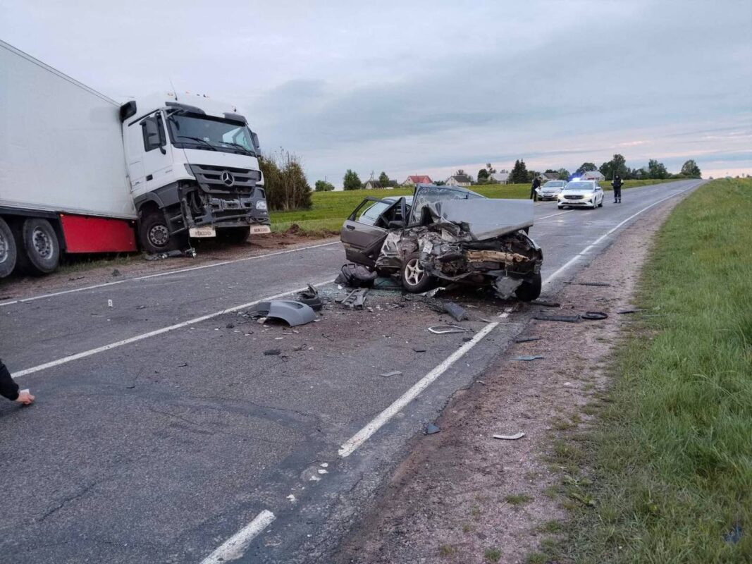 Происшествие случилось около 23:35 в четверг. 55-летний водитель грузовиква Mercedes при выезде с закругления на 58-м км дороги Ивье — Трокели — Радунь съехал на правую по ходу движения обочину, в результате чего потерял управление автомобилем. В итоге машина оказалась на встречной полосе, где врезалась в Audi 34-летнего мужчины.