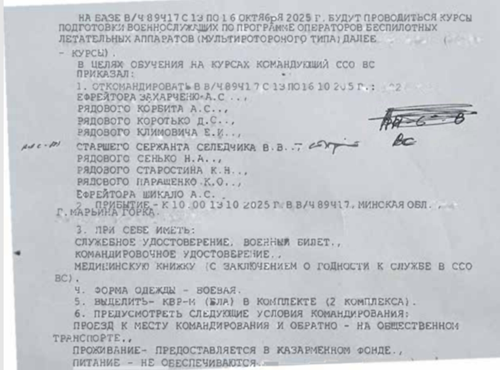 В документе содержится приказ откомандировать военнослужащих для прохождения подготовки по управлению беспилотниками мультироторного типа в военной части, дислоцированной в Марьиной Горке.