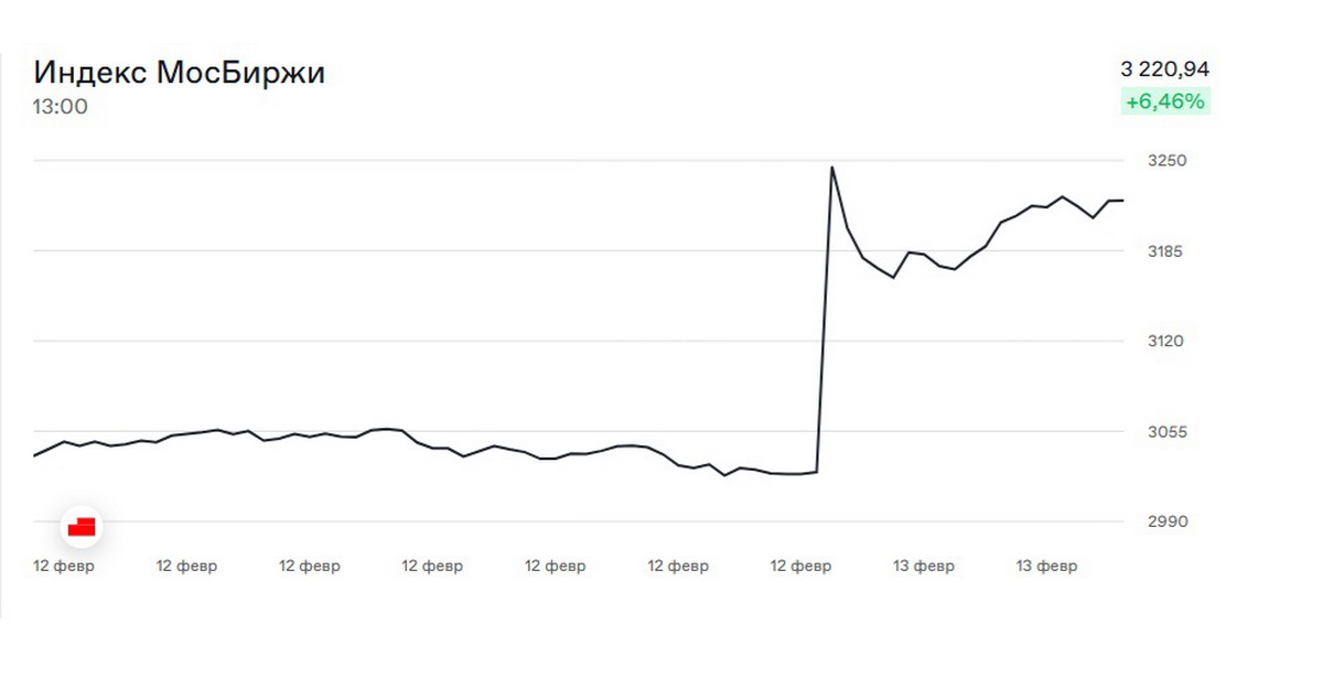 Индекс Московской биржи резко подскочил сегодня утром на открытии торгов на фоне вчерашнего разговора президентов США и России. Он вырос на 7,28% до 3246,02 пункта. К середине дня произошла корректировка, однако индекс все еще на 6,46% выше вчерашнего значения.