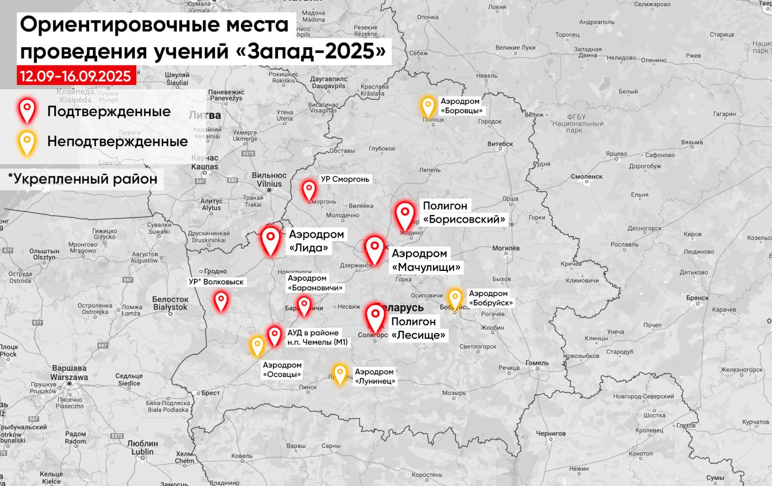 «Места проведения ССУ не претерпели существенных изменений — это полигоны «Борисовский» (где пройдет активная фаза), «Лесище», а также укрепленные районы на Волковысском и Сморгонском направлениях. Также будут задействованы аэродромы «Барановичи», «Мачулищи», «Лида» и аэродромный участок дороги. Минобороны Беларуси уточнило, что маневры проходят на полигонах, расположенных в глубине и на востоке страны», — говорится в обзоре.