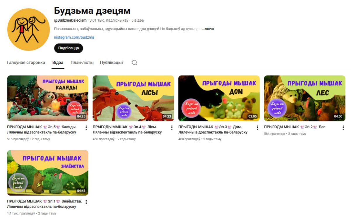 Суд Пружанского района признал «экстремистскими материалами» ютуб-канал «Будзьма дзецям». На канале опубликовано пять частей детского кукольного театра на беларусском языке «Прыгоды мышак».