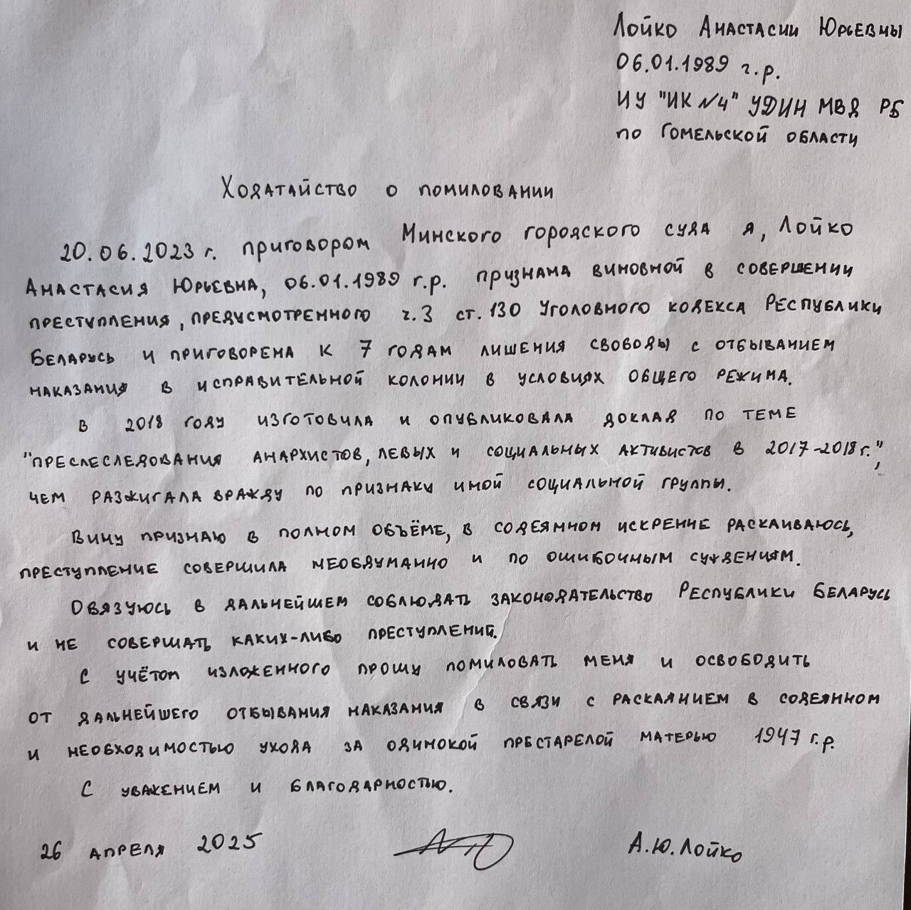 В канале опубликовано так называемое «ходатайство о помиловании», подписанное известной правозащитницей, основательницей Human Constanta Настой Лойко. Можно предположить, что Наста также помилована и будет освобождена.