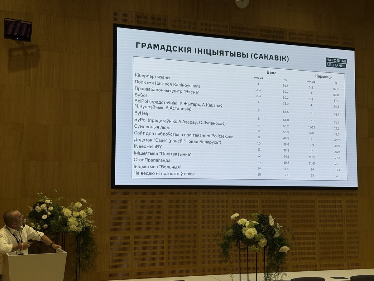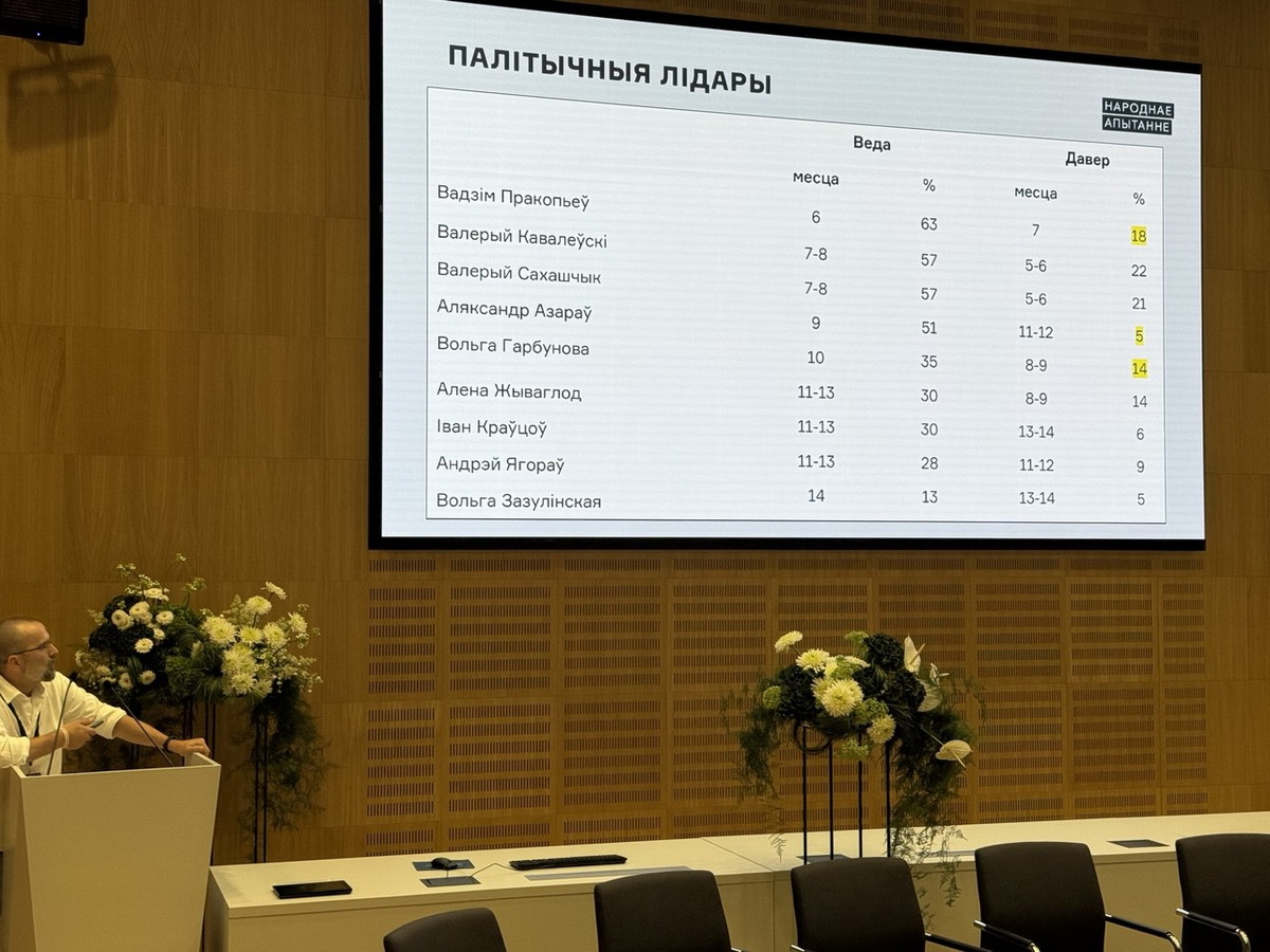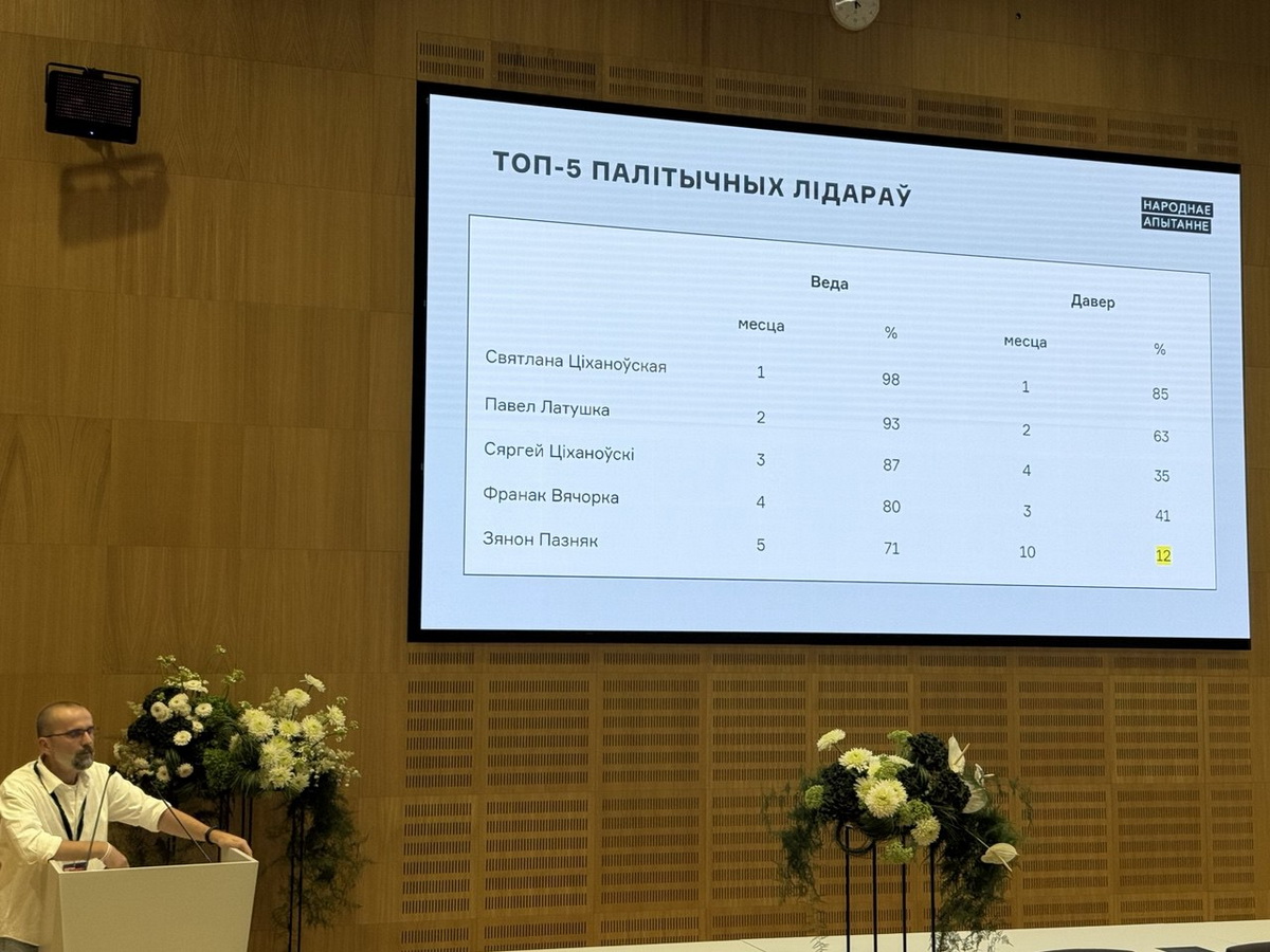 Третье и четвертое место делят Сергей Тихановский и Франак Вячорка. О деятельности первого знают 85% опрошенных, а доверяют ему 35%. О втором знают 80%, но доверяют ему только 41% респондентов.